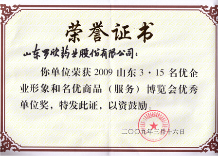 2009年3月15日,我公司參加由山東省消費者協會主辦的2009年山東3•15名優企業形象和名優商品(服務)博覽會,榮獲“2009年山東3•15名優企業形象和名優商品(服務)博覽會優秀單位獎”。