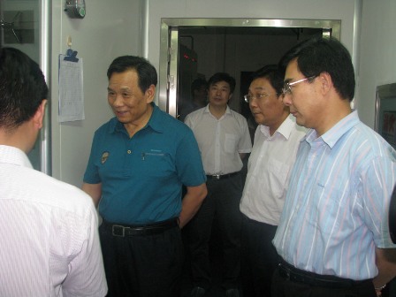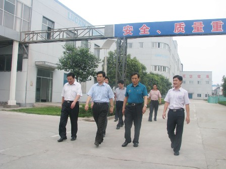 上圖為省金融工作辦公室主任李永?。ㄓ叶?,市委書記、市人大常委會主任連承敏(右三),區委書記王行華(左一)一行參觀公司廠區時的情景