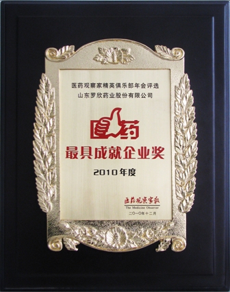 2010年12月8日,第64屆全國(guó)藥品交易會(huì)召開之際,醫(yī)藥觀察家報(bào)社在江西南昌召開了“十二五規(guī)劃•醫(yī)藥新格局高峰論壇暨《醫(yī)藥觀察家》精英俱樂部年會(huì)”。會(huì)上評(píng)選了十大醫(yī)藥精英獎(jiǎng)、最具投資價(jià)值企業(yè)獎(jiǎng)、最具市場(chǎng)潛力新品獎(jiǎng)和最具成就企業(yè)獎(jiǎng)四大獎(jiǎng)項(xiàng),我公司榮獲最具成就企業(yè)獎(jiǎng),中國(guó)醫(yī)藥企業(yè)管理協(xié)會(huì)、中國(guó)醫(yī)藥企業(yè)家協(xié)會(huì)會(huì)長(zhǎng)、北京醫(yī)藥集團(tuán)公司名譽(yù)董事長(zhǎng)、醫(yī)藥經(jīng)濟(jì)報(bào)首席專家、國(guó)家發(fā)展改革委員會(huì)生物醫(yī)藥專家委員會(huì)副主任、國(guó)家科技部國(guó)家重大專項(xiàng)專家委員會(huì)專家于明德給獲獎(jiǎng)單位頒發(fā)了獎(jiǎng)牌和證書。