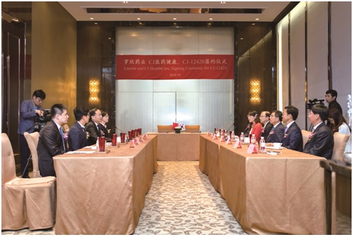 上圖為羅欣藥業(yè)CJ醫(yī)藥健康,CJ-12420簽約儀式現(xiàn)場